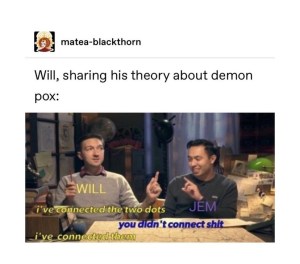 Jem even confesses his frustrations with Will before his steamy makeout sesh with Tessa.