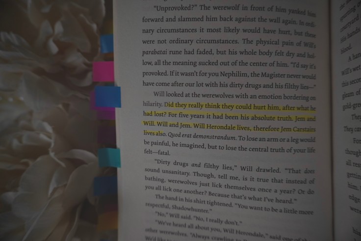 Side note! I would happily read a novella solely about the shenanigans these two got into in the years leading up to them meeting Tessa. I bet they were full of chaotic energy. Could you imagine 13-year-old Will and Jem wandering the streets of London, Will proclaiming that he finally found proof of demon pox and Jem rolling his eyes but following him anyway?