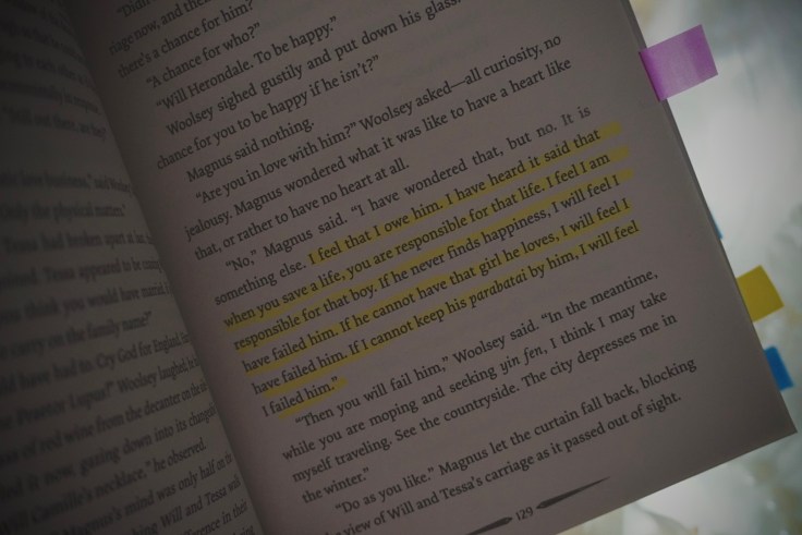 “I feel that I owe him. I have heard it said that when you save a life, you are responsible for that life. I feel I am responsible for that boy. If he never finds happiness, I will feel I have failed him. If he cannot have that girl he loves, I will feel I have failed him. If I cannot keep his parabatai by him, I will feel I failed him.”