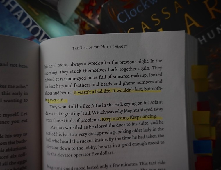 Then, in “The Rise of the Dumort”, Magnus gives his tactic of “Keep moving. Keep Dancing,” to avoid his problems and how time always seemed to change pace.