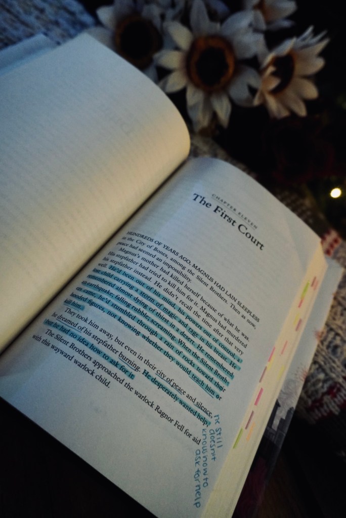 First, readers get a tender moment between Jace and Alec when both parabatai can’t sleep. The pair discuss the decision to run the Institute and Alec’s worries about Magnus. (Clare really does a much better job at developing the bond between Jace and Alec in this book, and I’m very thankful.)