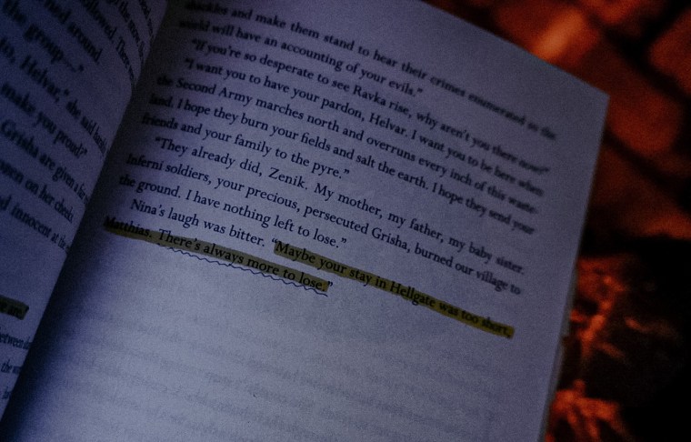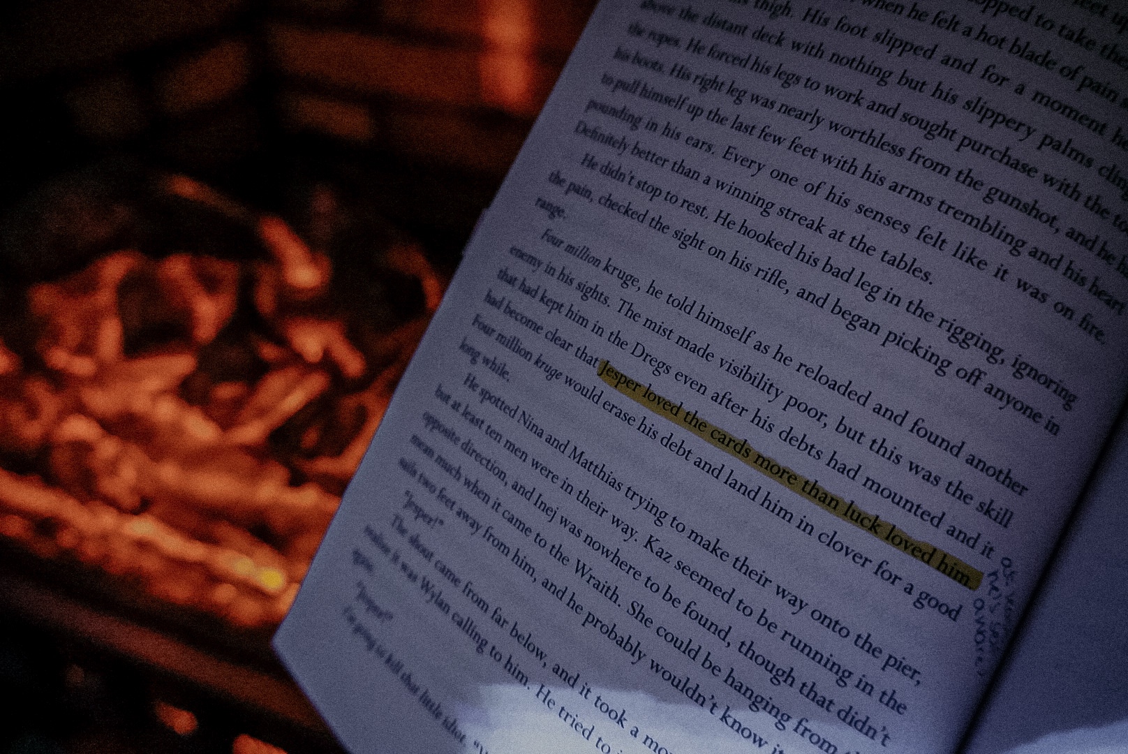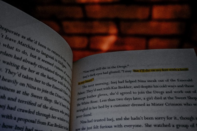 I loved so much about this novel. Inej’s character development was top tier, the creation of Kaz’s infamous legacy was exquisite, Nina and Matthias’ banter made my heart shatter and melt at the same time, and Wylan and Jesper found ways to make me cackle even in the heat of life and death situations.