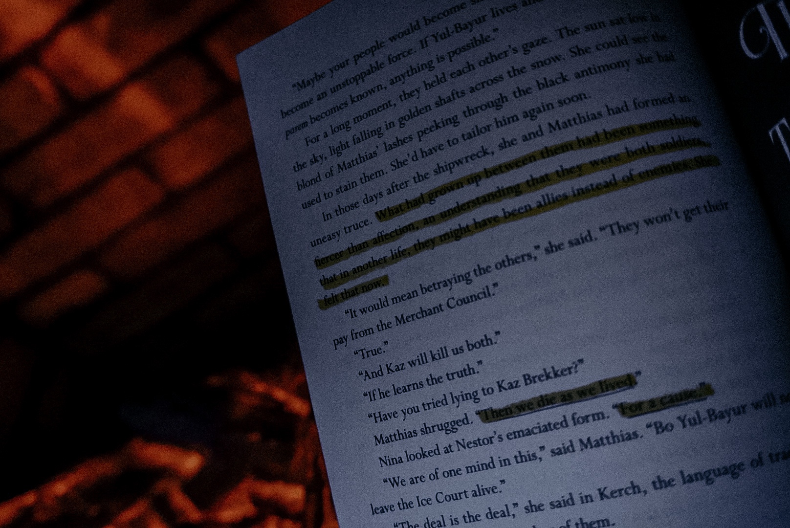 - Nina accusing Matthias of being a slaver in order to prevent him from being taken by Grisha, who probably would’ve had him stand trial for his life as a druskelle. He could’ve been executed if Nina hadn’t stepped in.