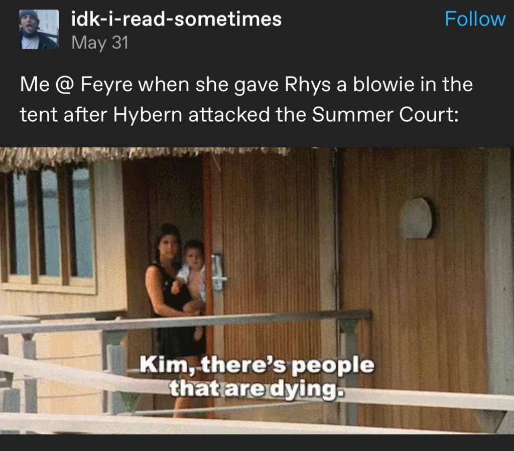 Final side note! The randomness of the smut in this book makes me laugh so hard. Like people are fucking dying, and Feyre is sucking off Rhys in their tent. Girl, now is not the time. Let’s get our priorities together. It’s war. (Feyre, there’s people that are dying.)