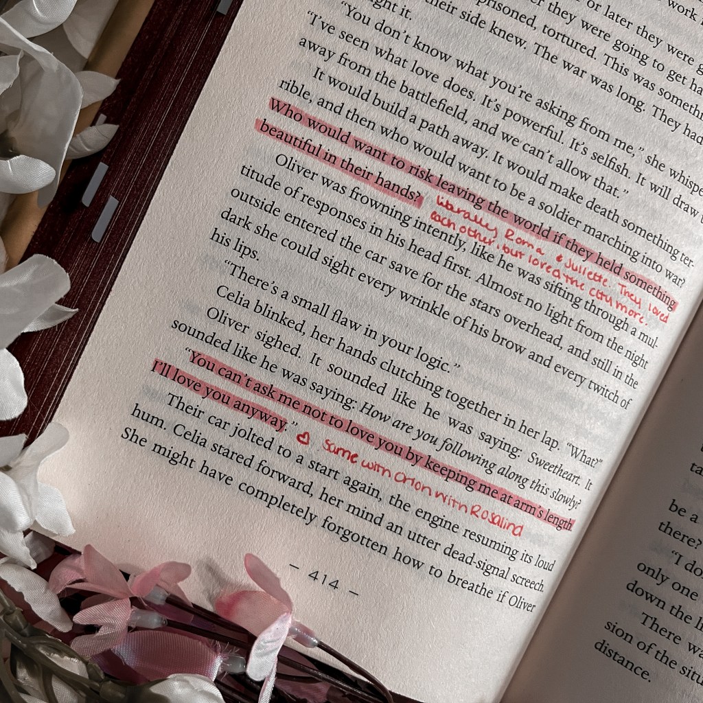 Along the same line, I wanted more of the dynamic between Oliver and Orion. There’s so much tension between the two brothers, and it’s not really explored enough to make sense except knowing they’re on separate sides of both this political push and family dispute. I think a lot of my wanting stems from me already knowing so much about what happened between Celia and Rosalind. We had two books to learn their dynamic, but we don’t have that same connection with Orion and Oliver so I wanted more to fill the void. Once again, there’s another book so maybe this itch will be scratched when it comes out. - Just this: Celia and Rosalind as two women incredibly afraid of love the power it has over people and Oliver and Orion as two men who want nothing more than to love despite everything.