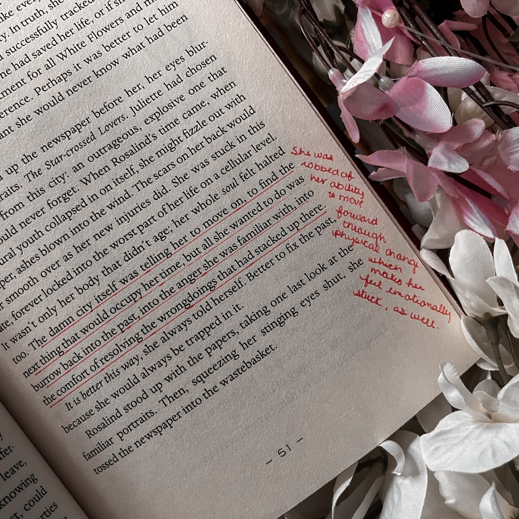 Throughout the book, I kept thinking about how Roma once turned a blind eye to seeing Rosalind in White Flower territory because he saw her as harmless. She can no longer be overlooked.