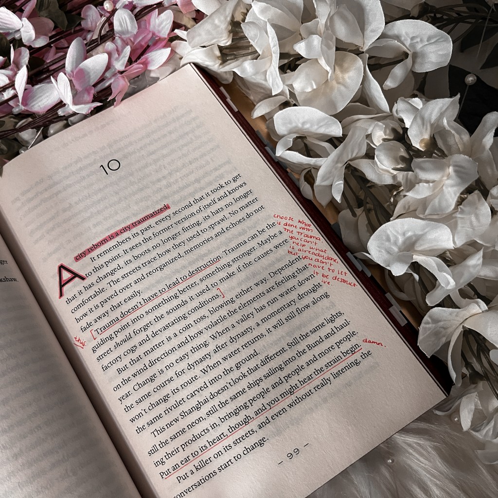 - The thing about Gong’s writing that I find so unique to her and am positively obsessed with is how she makes the setting a character. So often the setting is just that: the setting. It’s the board on which our pieces move. Gong makes the setting its own piece. The characters interact with the setting rather than in the setting. That’s partially due to the political factors. The plot centers around characters fighting (and spying) for their nation and families in all sorts of ways and for all sorts of reasons that have landed them on opposite sides. That automatically pulls Shanghai and China as a whole into the equation — a constant pressure that increases each time a character looks around them. It adds intensity because the plot never rests. It’s all-encompassing. It’s honestly magic.