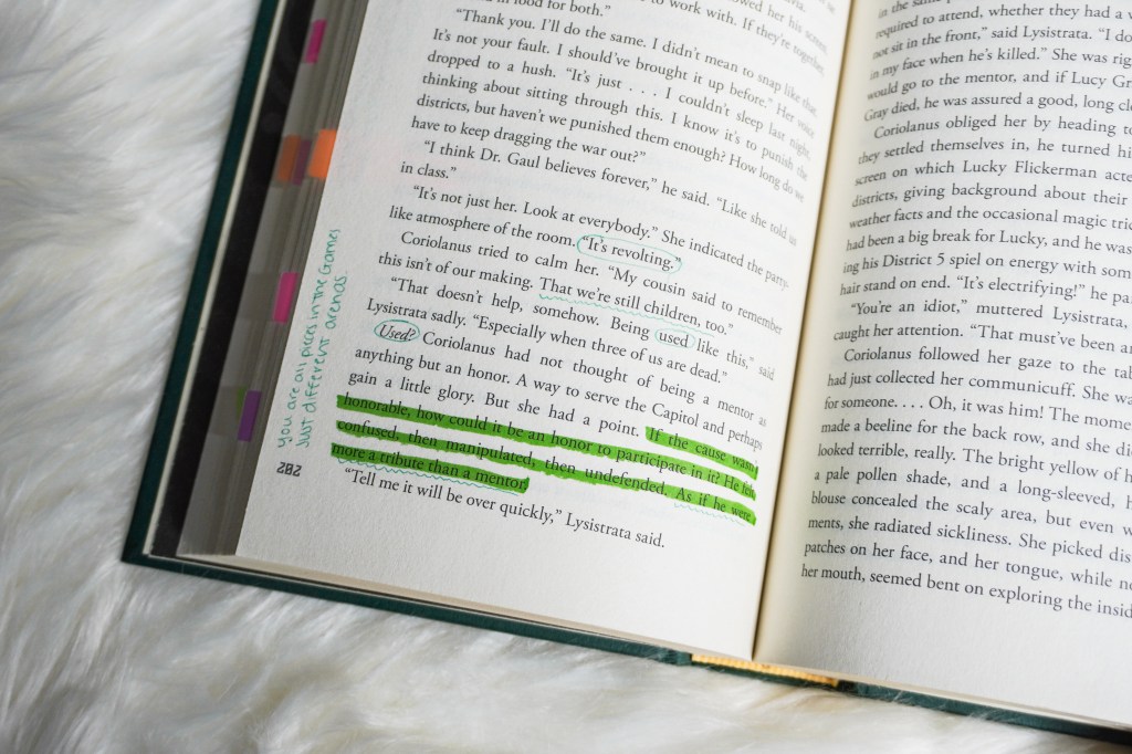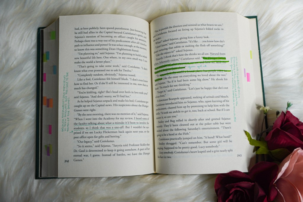 I also enjoyed the running motif of Lucy Gray’s ballads throughout the novel. They almost haunt the narrative as Snow listens and turns them over and over and over.