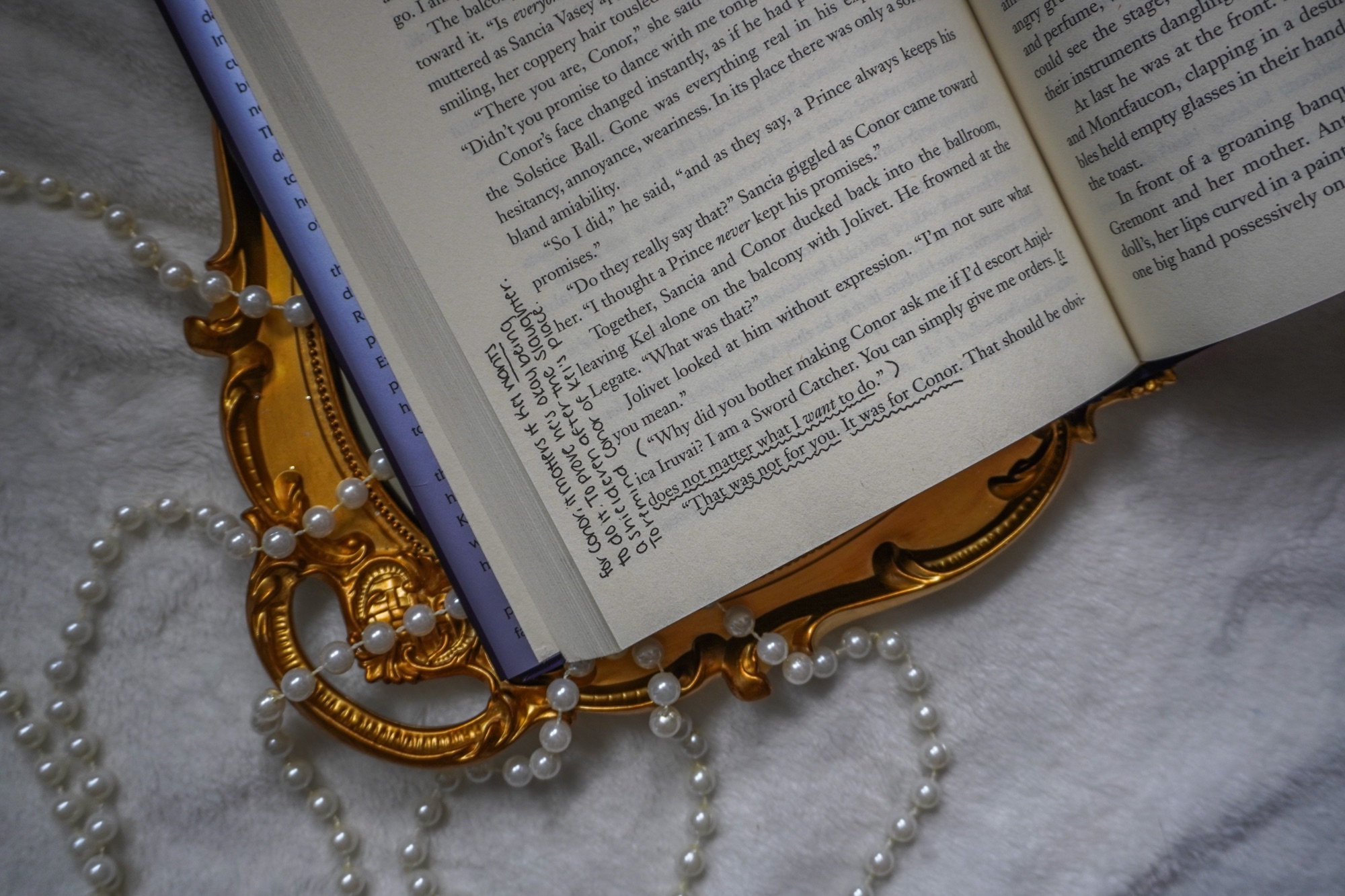 In particular, Clare did this wonderful thing of juxtaposing Conor and Kel as they developed. As Conor gets more serious about his duty as future King, Kel loosens his reins on being a Sword Catcher. We see them both make mistakes in their duties: Kel eating the nut and then Conor acting as if he didn’t speak to someone when Kel was posing as him.